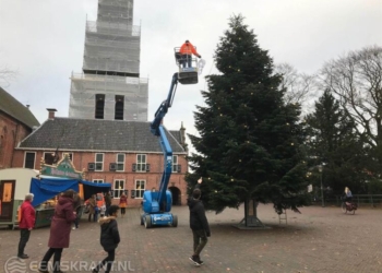 Lees meerDetailsAppingedam - De kerstboom wordt op het plein bij de Nicolaïkerk geplaatst. Kinderen van basisschool CBS ...