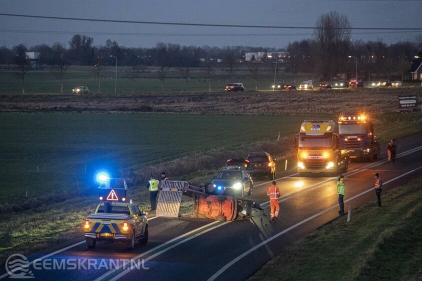 Laskwerd – Op de N33 ter hoogte van Laskwerd is vanmiddag een aanhanger met daarop een heftruck gekanteld. Hoe dit kon gebeuren is onbekend.