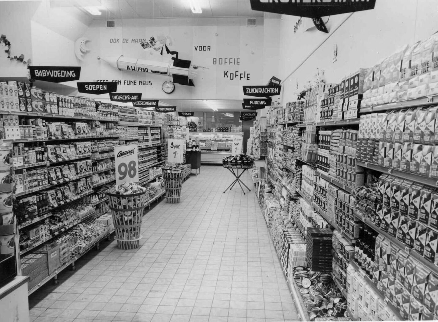 Het interieur van Albert Heijn Delfzijl aan de Schans 9 in Delfzijl. Datering tussen 1959 en 1970. Dit beeld is afkomstig van Stichting Albert Heijn Erfgoed: https://albertheijnerfgoed.nl