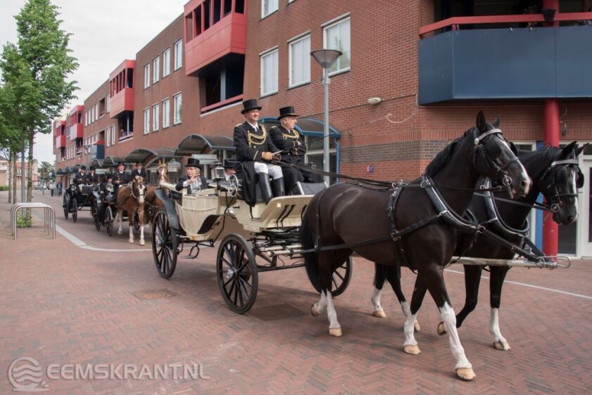Delfzijl – De Pinksterfeesten in Delfzijl zijn vooral gebouwd op tradities. Een van die tradities is de Aubade door het Neptunus bestuur gevolgd door een rijtour met de burgemeester. Ook dit jaar werd de rijtour werd gedaan met paard en wagen. Het gezelschap vertrok om 10:00 uur bij Hotel Boven Groningen en stopte bij restaurant Vecchia Roma aan de Willemsstraat daar wordt jaarlijks het eerste borreltje genuttigd. Na de borrel werd buiten het Neptunuslied gezongen, daarna werd onder muzikale begeleiding van muziekvereniging D.H.O het Kamper TrompetterKorps en het Kamper jeugd Trompetterkorps naar het gemeentehuis gelopen. Waar het gemeentebestuur het Neptunus bestuur ontving op het bordes van het gemeentehuis.