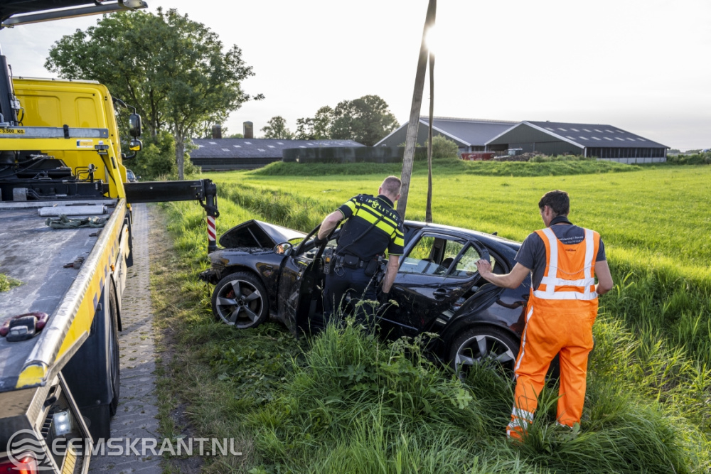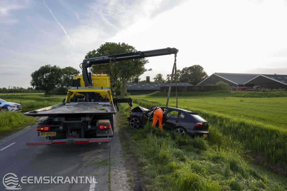 Een bergingsbedrijf heeft de zwaar beschadigde auto uit de sloot gehaald.