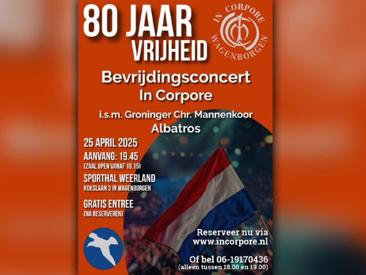 Wagenborgen – Op vrijdag 25 april organiseert muziekvereniging In Corpore een bijzonder Bevrijdingsconcert in sporthal Weerland in Wagenborgen. Dit concert staat in het teken van 80 jaar bevrijding van Nederland en biedt een avond vol muzikale beleving en bezinning.
