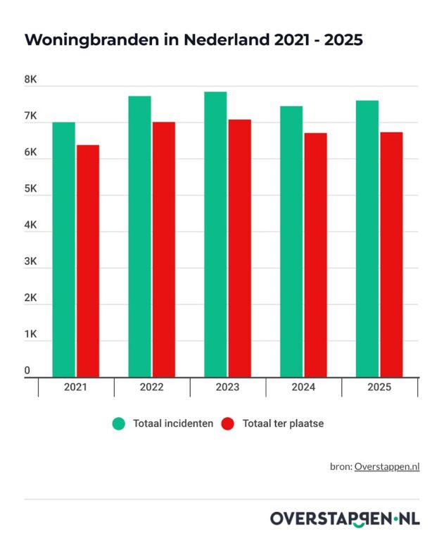 Nederland – Het aantal woningbranden in Nederland ligt in 2025 opnieuw hoger dan het jaar ervoor. Ondertussen groeit de inzet van de brandweer nauwelijks mee. Dat blijkt uit een analyse van data van het Nederlands Instituut Publieke Veiligheid (NIPV) door vergelijkingssite Overstappen.nl. De cijfers laten zien dat meldingen steeds minder vaak leiden tot een uitruk, al zijn er grote verschillen tussen provincies te zien. In 2025 werden in Nederland 7.594 woningbranden geregistreerd. In datzelfde jaar kwam de brandweer 6.724 keer ter plaatse. Daarmee groeit het aantal incidenten sneller dan het aantal keer dat de brandweer op locatie kwam.