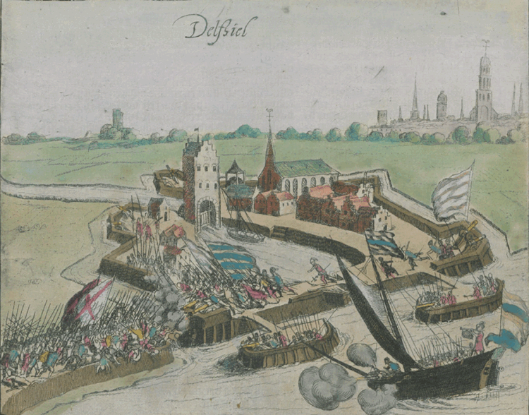 Delfzijl – In de bibliotheek van Delfzijl worden tijdens de Open Monumentendag op 13 september een drietal bijzondere prenten getoond, die recent in archieven zijn gevonden. Het gaat hierbij om vermoedelijk de oudste kleuren gravures van Delfzijl. De afbeeldingen maken deel uit van een album uit 1616 over veldslagen tijdens de 80-jarige oorlog. Delfzijl speelde als vestingstad in die tijd een belangrijke rol. In 1591 werd ‘Delfsiel’ bevrijd van de Spaanse overheersing en in 1594 werd een aanval van de Spanjaarden afgeslagen. Op een van de gravures is zelfs een overzicht van de provincie te zien, waarbij een veldheer in harnas uitkijkt over oprukkende troepen.