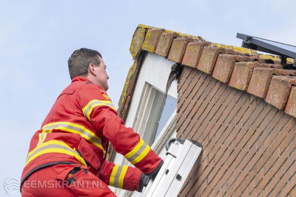 Delfzijl – De brandweer van Delfzijl heeft vrijdagochtend een zwaluw bevrijd die vast was komen te zitten met zijn vleugel tussen de dakpannen en de gevel van een woning aan de Kustweg in Delfzijl. Een stukadoor die aan het werk was bij de woning hoorde het dier krijsen en ging op onderzoek uit, waarbij hij het vogeltje ontdekte. Na contact te hebben opgenomen met de dierenambulance werd geadviseerd om de brandweer te bellen.