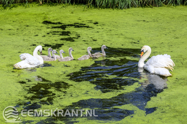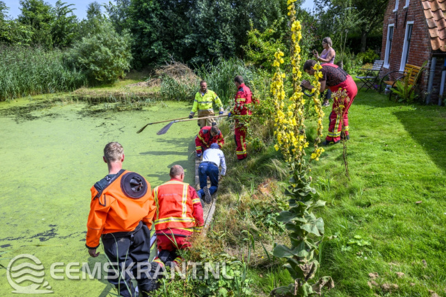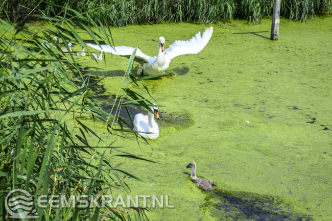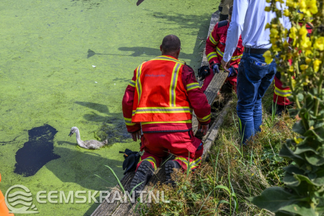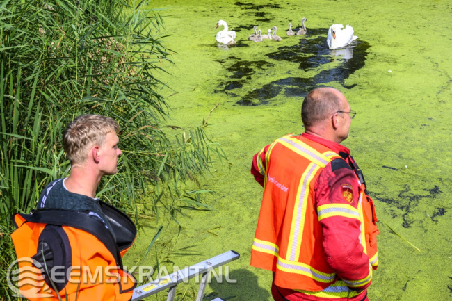 Nieuwstad – In een vijver achter een woning aan het Nieuwstad bij Bierum zijn vrijdagmiddag twee jonge zwanen vast komen te zitten onder een steiger. De kuikens waren via een opening in een doek gezwommen dat juist was aangebracht om te voorkomen dat ze onder de steiger zouden gaan zitten.