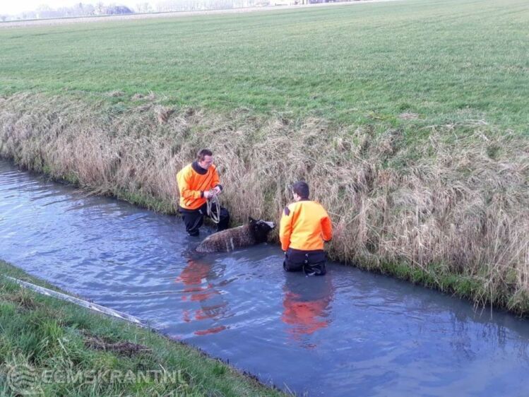 Brandweerlieden in waadpakken hebben hier dier met vereende kracht weer op het droge gekregen, waarna het schaap door de boer op stal werd gezet om op te warmen.
