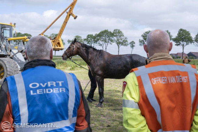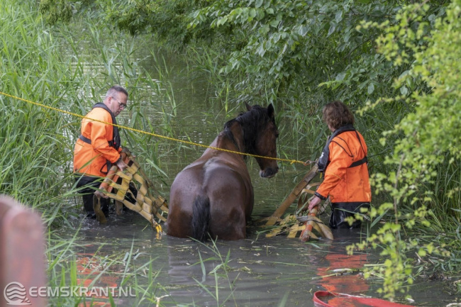Hierop werd het korps van brandweer Delfzijl gealarmeerd met het hulpverleningsvoertuig met kraan. En even later werd ook het oppervlakte reddingsteam (ORT) van brandweer Delfzijl opgeroepen. Gezamenlijk hebben de korpsen het paard voorzien van een paardenbroek, hiermee kon het paard met een shovel de sloot uit worden getild. Nadat het paard even op kracht was gekomen stond het al snel weer in de benen. Een dierenarts zal het dier nog onderzoeken.
