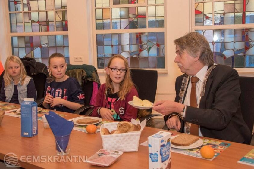 Delfzijl – Burgemeester Gerard Beukema heeft donderdagochtend groep zeven van basisschool Farmsumerborg ontvangen in de Raadszaal van het gemeentehuis. Dit gebeurde ter gelegenheid van het Nationaal Schoolontbijt. Tijdens het ontbijt reikte de burgemeester een cheque ter waarde van 150 euro uit die ten goede komt aan de Linda Foundation. Het goede doel dat dit jaar gekoppeld is aan het Nationaal Schoolontbijt.