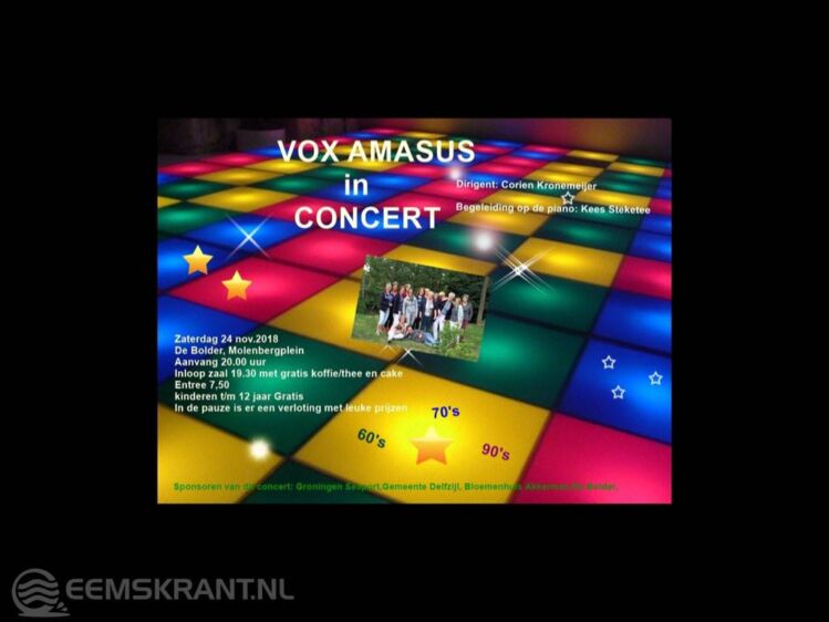 Delfzijl – Het koor Vox Amasus geeft zaterdag 24 november om 20.00 uur een concert in de Bolder. Vox Amasus bestaat uit 20 enthousiaste vrouwen onder leiding van Corien Kronemeijer. Het koor zal begeleid worden door Kees Steketee op piano.