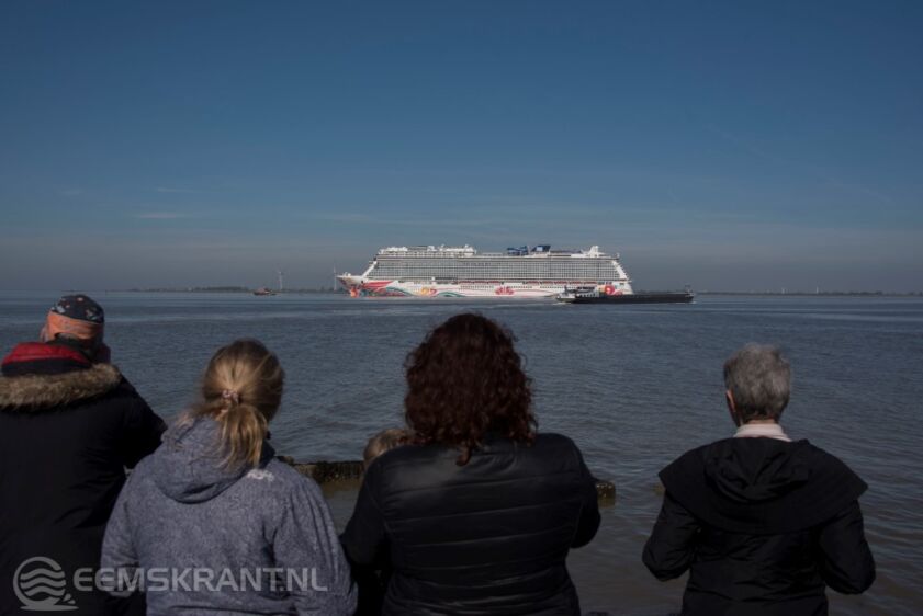 Eemshaven – Het vier na grootste cruiseschip te wereld de Norwegian Joy eerder dan verwacht aangekomen in de Eemshaven. Het 326 meter lange schip is gebouwd op de Meyer Werft in Papenburg. Daar vertrok het zondagavond, na een nachtelijke reis over de Ems passeerde het cruiseschip aan het begin van de middag het Emssperrwerk in Gandersum.