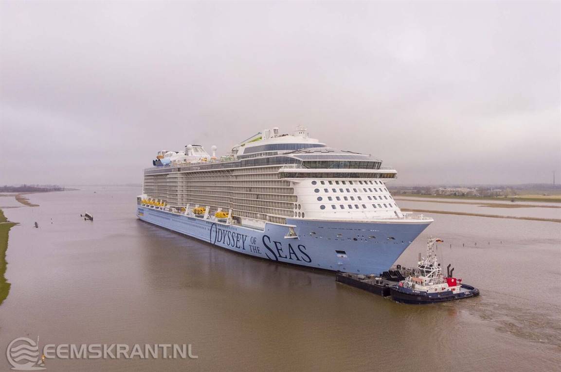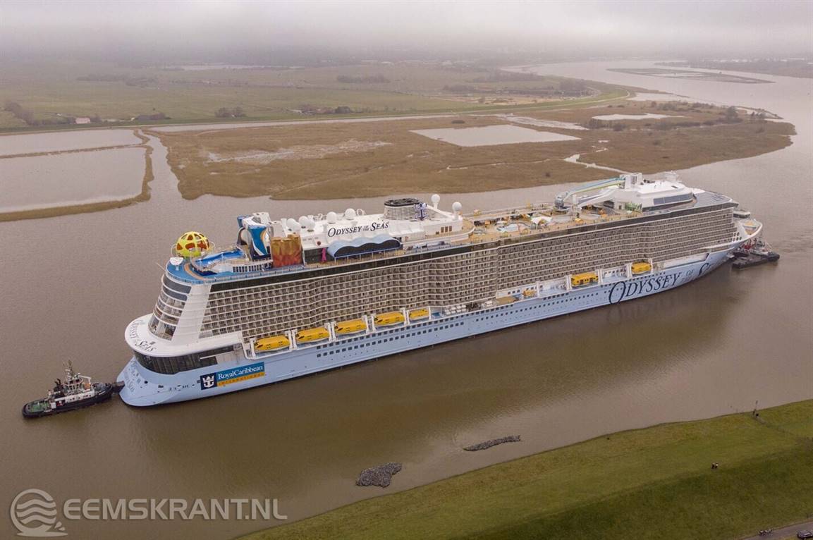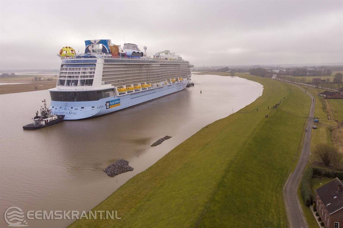 Eemshaven – Het cruiseschip Odyssey of the Seas is afgelopen nacht vertrokken vanaf Meyer Werft in Papenburg en is onderweg naar de Eemshaven voor een kort verblijf. Zaterdagnacht om 04:00 uur verliet het cruiseschip de werf in Duitsland. Net als bij elk ander cruiseschip, wordt de Odyssey of the Seas ook achteruit de Eems afgevaren met behulp van twee sleepboten. Dit wordt gedaan vanwege een betere manoeuvreerbaarheid van het schip.