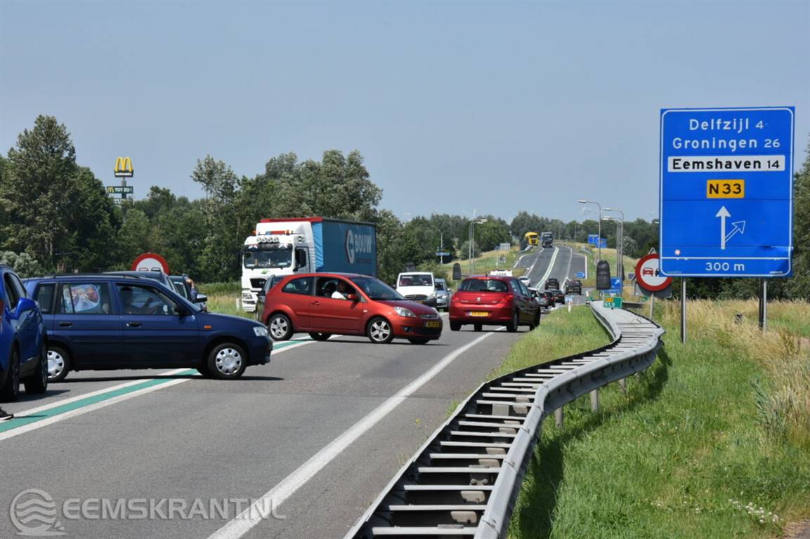 Pas in de loop van de avond wordt gekeken of de brug weer naar beneden kan voor het wegverkeer. tot die tijd moet het verkeer op de N33 tussen de Eemshaven en Zuidbroek moet omrijden.