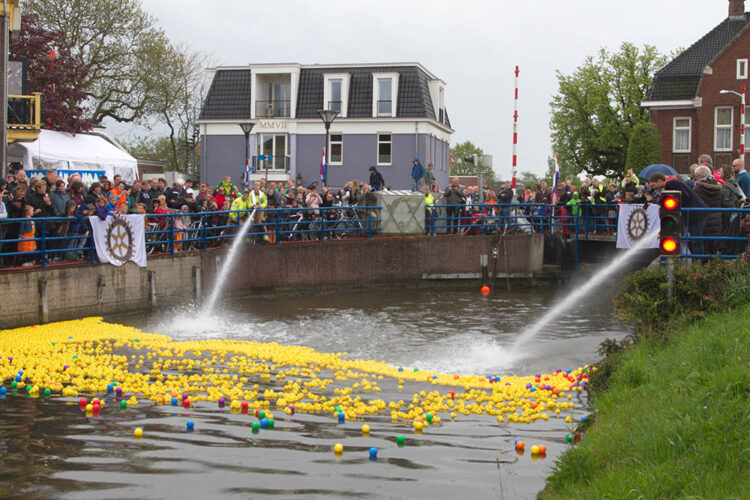 Bedum – Op Koningsdag, zaterdag 26 april om 17.00 uur, werpt Karen Karen Hansems, wethouder Sport en bewegen en Volksgezondheid van de gemeente Hogeland met behulp van een shovel een paar duizend badeendjes in het Boterdiep WZ, naast Hotel ‘t Gemeentehuis in Bedum. Alle eendjes dragen een rugnummer en de eerste eendjes die over de finish komen scoren voor de eigenaar van het lot met het nummer van de eendjes fraaie prijzen.