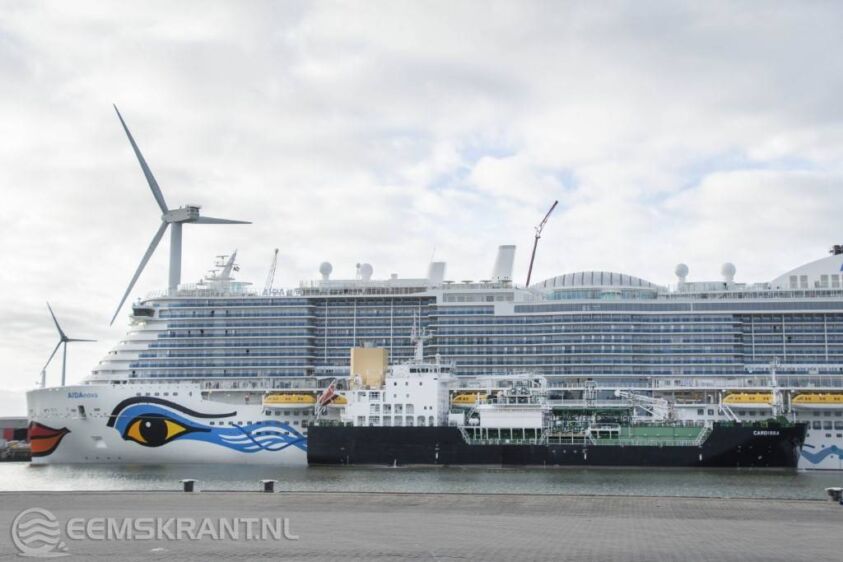 Eemshaven – In de Eemshaven vind op dit moment de eerste LNG bunkering (tanken van een schip) van het cruiseschip AidaNova plaats in de Eemshaven. Niet alleen de komst van het cruiseschip was een primeur voor de haven ook het bunkeren van LNG heeft hier nog nooit plaats gevonden.