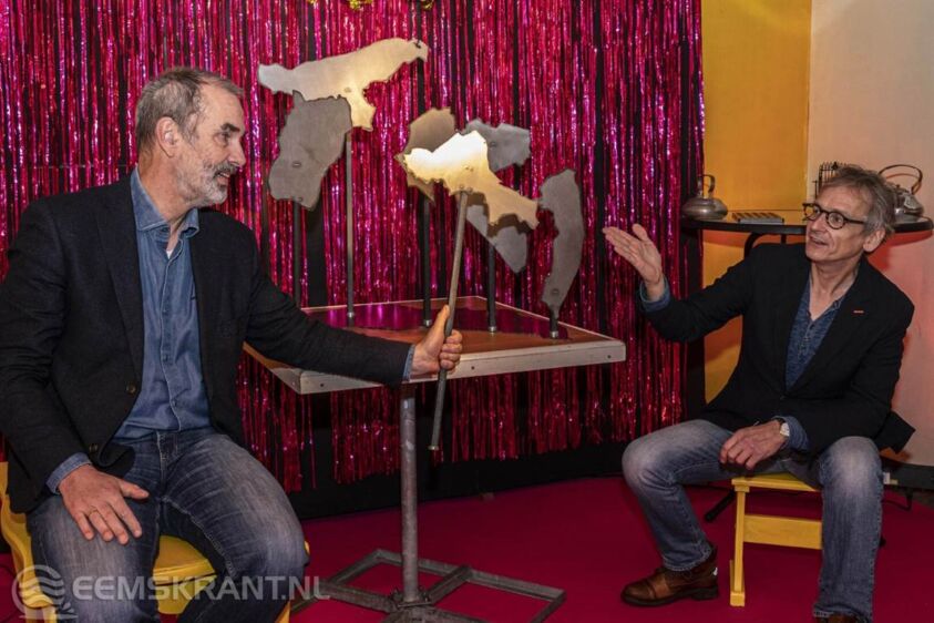 In voormalig café Het Anker in Delfzijl heeft wethouder cultuur van de gemeente Delfzijl, Hans Ronde die mede namens Appingedam en Loppersum, de toekomstige gemeente Eemsdelta heeft geplaatst op het estafettekunstwerk dat meereist met het project.