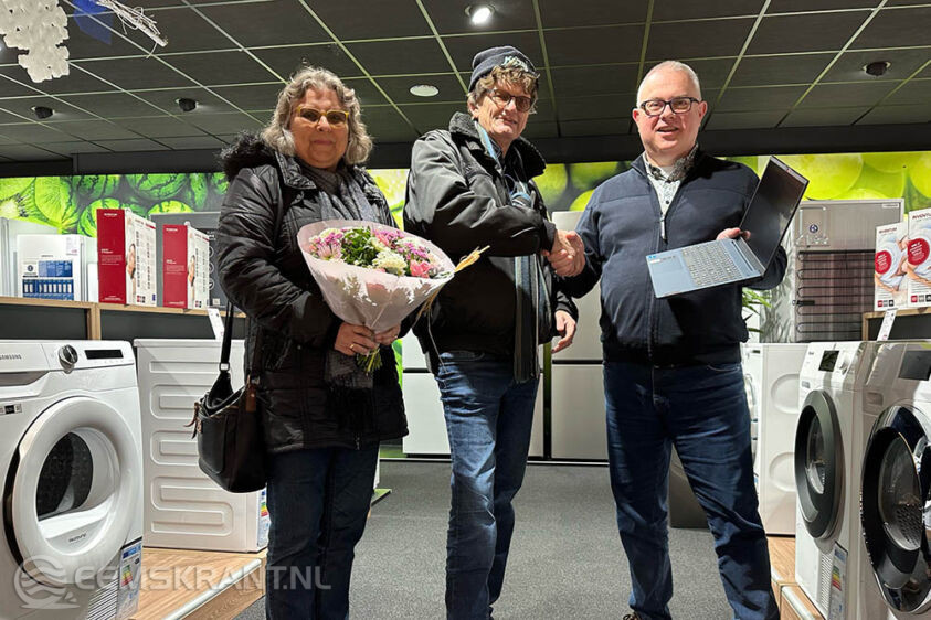 Delfzijl – Afgelopen vrijdag heeft de familie Nannen uit handen van Otto van der Holt van EP OJE Electronics in de Waterstraat in Delfzijl een prachtige laptop mogen ontvangen. De familie Nannen is de winnaar geworden van de WinterWinActie 2023. Uiteraard was er voor de winnaar een mooi boeket bloemen die werd aangeboden door het DOK (ondernemers centrum Delfzijl).