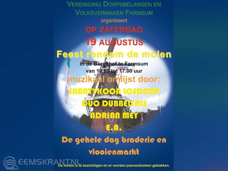 Farmsum – Op zaterdag 19 augustus organiseert Vereniging Dorpsbelangen en Volksvermaken Farmsum het jaarlijks Feest rondom de molen, van 10.00 tot 17.00 uur in de Borgshof. Er is de hele dag braderie, rommelmarkt, overdekt terras en live muziek van o.a. Shantykoor Losdorp, Duo Dubbelfris, Adrian Mey e.a.