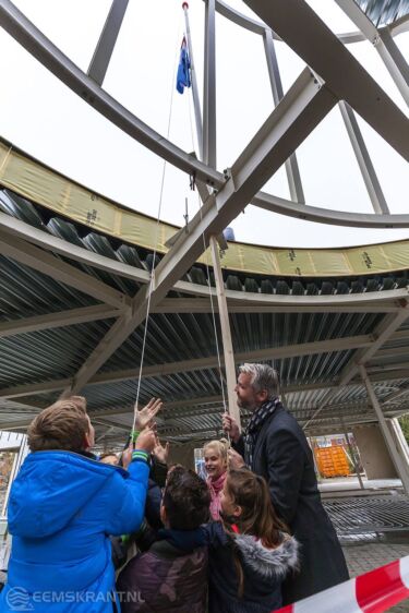 Later deze middag was er ook in Loppersum een officieel moment om stil te staan bij de bouw van het kindcentrum. De vlag werd gehesen op het hoogste punt van het kindcentrum. Leerlingen van basisscholen Prinses Beatrix en Roemte en kinderen van Kids2b overhandigden hun tijdcapsules, die net als in Middelstum een plek in het kindcentrum gaan krijgen.