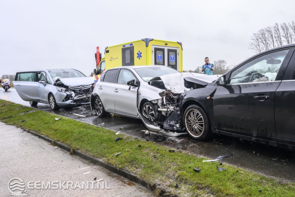 Volgens eerste informatie kwam één van de voertuigen op de verkeerde weghelft terecht en botste frontaal op een tegemoetkomende auto. Een derde voertuig dat daarachter reed kon niet meer op tijd stoppen en botste vervolgens op één van de betrokken auto’s.