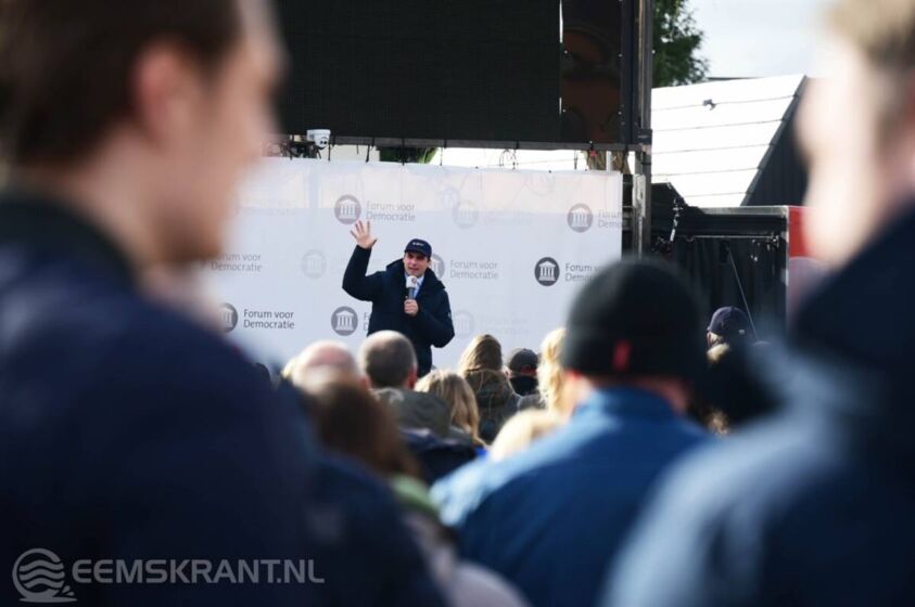 Appingedam – Het Forum voor Democratie (FVD) heeft vandaag Appingedam bezocht. De partij noemt het de ‘vrijheidskaravaan’. Vanmorgen waren leden van de partij al druk bezig om het mobiele podium neer te zetten. Ondertussen werd het steeds drukker op het Cleveringaplein. Even na elf uur vanmorgen kwam de partijleider, Thierry Baudet, aan op het plein.