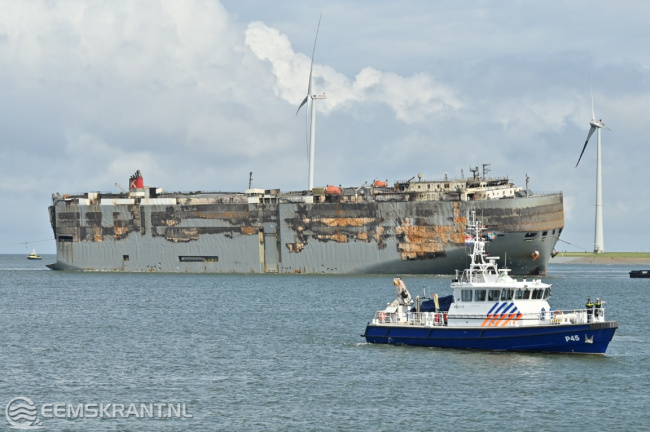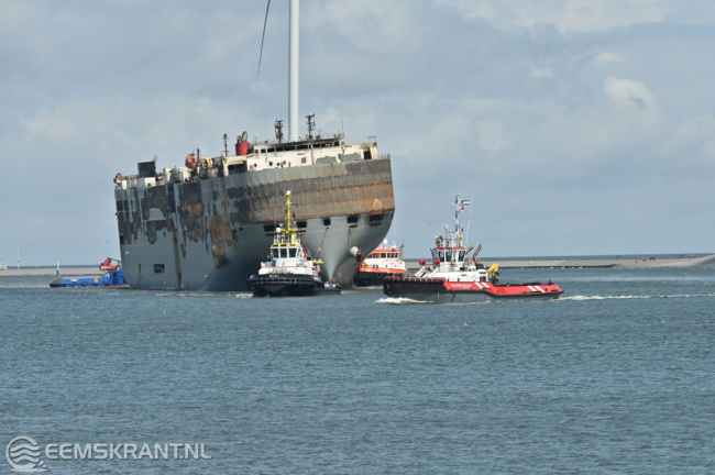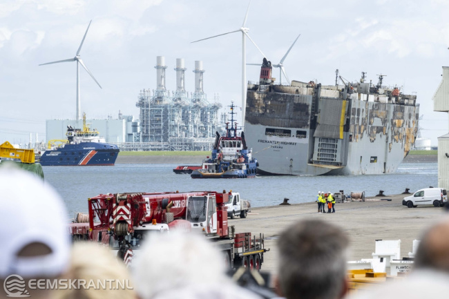 Eemshaven – Vandaag, rond 13.30 uur, is het uitgebrande autoschip Fremantle Highway aangekomen in de Eemshaven. Het schip werd door sleepboten veilig de havenmond ingevoerd en is inmiddels stevig afgemeerd aan een kade. De autoriteiten zijn momenteel druk bezig met het onderzoeken van de verdere stappen die moeten worden genomen. Een belangrijk aspect hierbij is dat het schip uiterlijk 14 oktober moet vertrekken, omdat de kade dan weer nodig is voor het afbouwen van een cruiseschip.