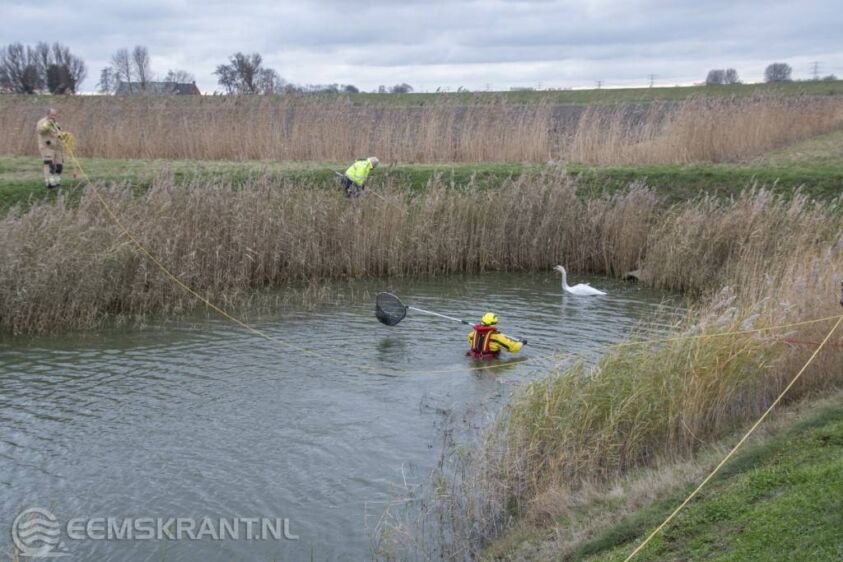 Eemshaven – Aan de Oostpolderweg in de Eemshaven heeft de brandweer donderdagmiddag samen met de dierenambulance Groningen een gewonde zwaan gered. Medewerkers van de dierenambulance probeerden het gewonde dier al sinds woensdag te vangen maar steeds was het beest ze te snel af.
