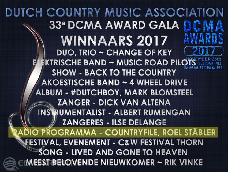 De 3 inzendingen met de hoogste waardering werden voor de DCMA Radio Award 2017 genomineerd. Op het 33e Award Gala werden ook de awardwinnaars in de andere categorieën bekend gemaakt. Zo ging er nog een award mee naar het Noorden, zangtalent Rik Vinke (18) uit Schoonebeek werd bekroond tot ‘meest veelbelovende nieuwkomer’ van de countrymuziek. Countrykoningin Ilse de Lange zwaaide hem alle lof toe.