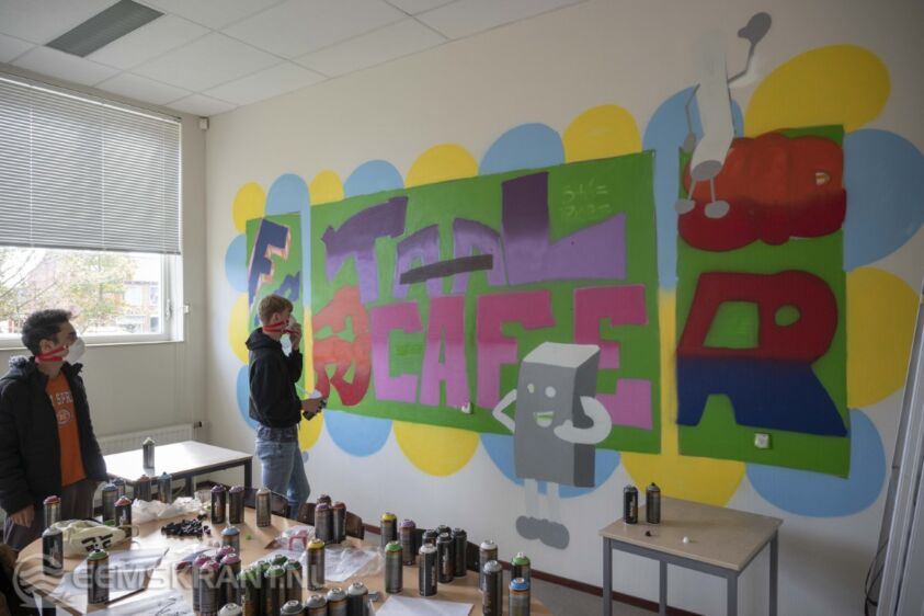 Zaterdag mochten ze echt aan de slag op een muur in een van de ruimtes in het Kajuit, Gezien het een oude school is hadden de jongeren een schoolbord ontworpen voor het taal café. De jongeren zijn de hele dag druk bezig geweest met het aanbrengen van de graffiti wandschildering.