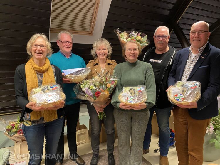 Op de foto (v.l.n.r.) de jubilarissen: Carla Dallinga is 30 jaar lid van DSHO, Jans Slachter 50 jaar lid van DSHO en KNMO, Gerda Linstra is 30 jaar lid van DSHO, Harma Dijkema-Hoogstra is 35 jaar lid van de KNMO en Elzo Medema en Roelf Schipper zijn beide 55 jaar lid van de KNMO.