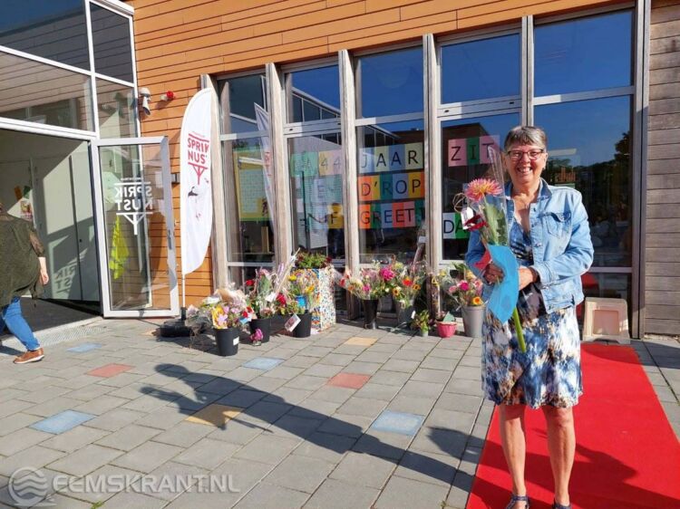 Vanochtend werden door alle leerlingen van CBS Roemte in Loppersum een bloem overhandigd aan juf Greetje.