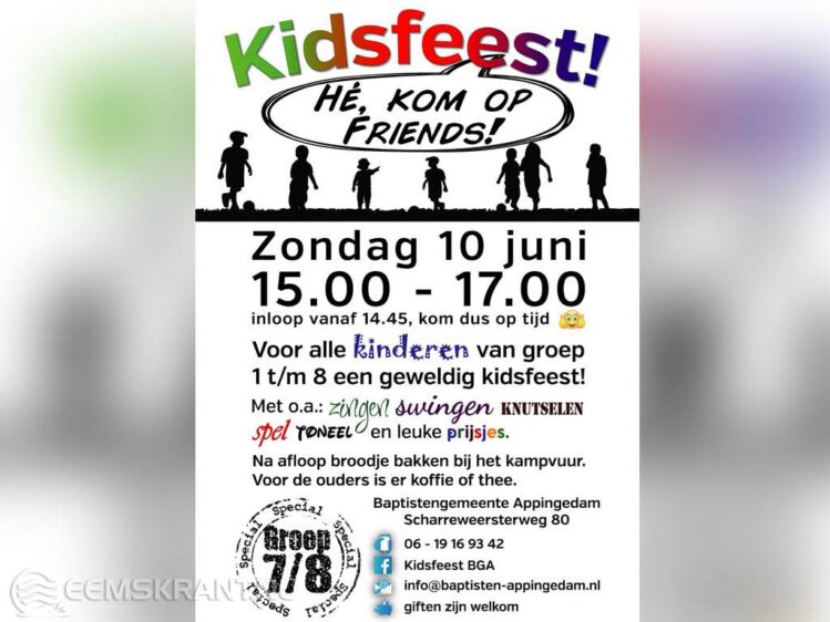 Appingedam – Zondag 10 juni van 15.00u-17.00u wordt er voor kinderen van de basisschool bij de Baptisten Gemeente Appingedam, Scharreweersterweg 80 een kidsfeest georganiseerd. Het thema is: He, kom op!..Friends!