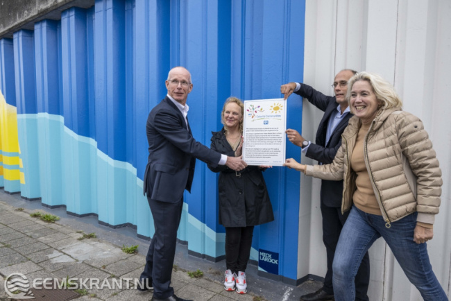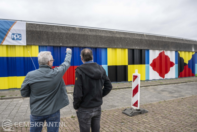 Delfzijl – Het kunstwerk op de damwand in Delfzijl is klaar. Dinsdag 3 oktober heeft graffiti artist Mick La Rock haar tag op de wand gezet. Vrijdagmiddag vond de overdracht van het kunstwerk plaats namens PPG industries Delfzijl aan vertegenwoordigers van de gemeente Eemsdelta en het waterschap Noorderzijlvest.