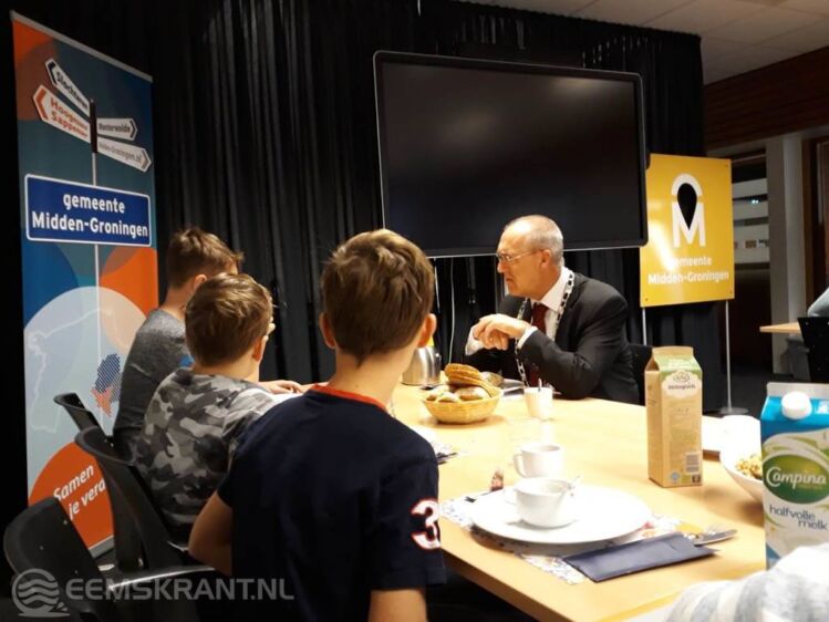 Burgemeester Hoogendoorn: ‘Deze uitnodiging heb ik met veel plezier aangenomen van de kinderen uit Slochteren. Ontbijt is de belangrijkste maaltijd van de dag en ik schuif graag bij hen aan. Ze hebben zelf ontbijt meegebracht en dat met mij gedeeld. Als je met elkaar eet, smaakt het ook nog lekkerder. En wat ook goed is, we helpen ook nog andere kinderen met de donatie aan Stichting Kinderpostzegels.’