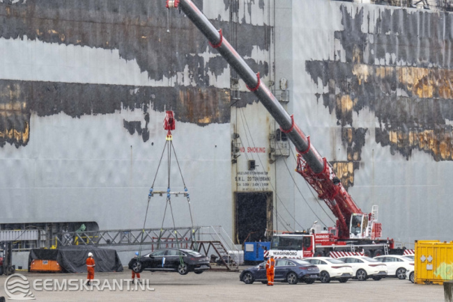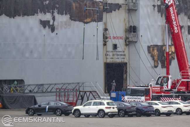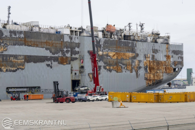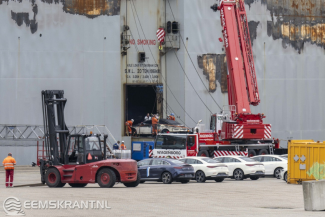 Eemshaven – Sinds 19 augustus zijn bergers bezig met het lossen van het vrachtschip Fremantle Highway, dat op 25 juli getroffen werd door een brand ten noorden van Ameland. Het lossingsproces is nog steeds gaande, en opmerkelijk genoeg worden vrijwel onbeschadigde voertuigen van boord gehaald.