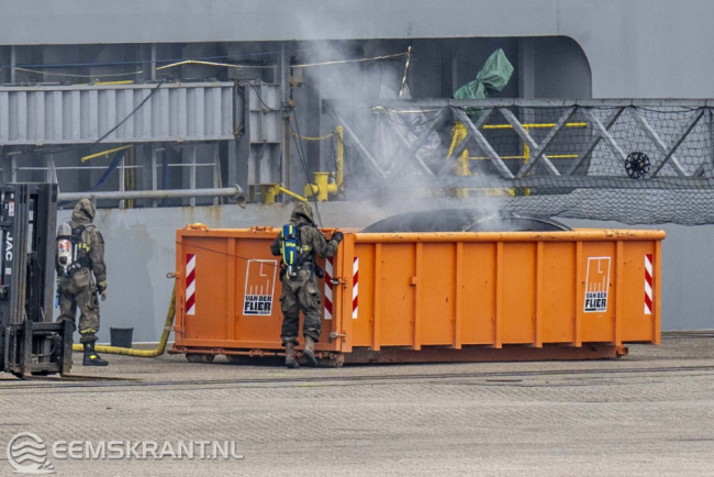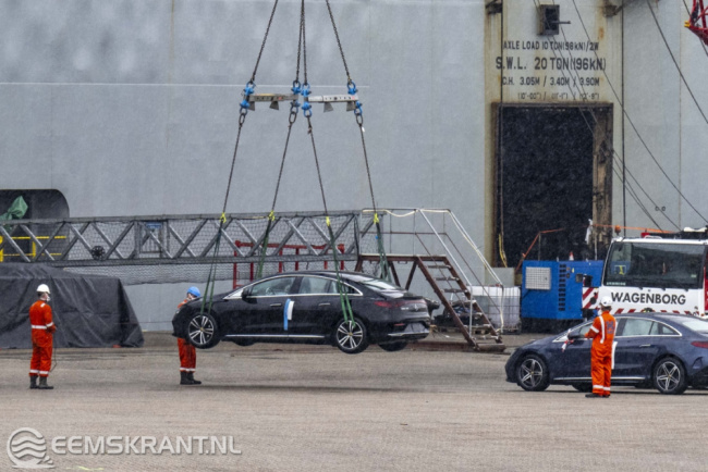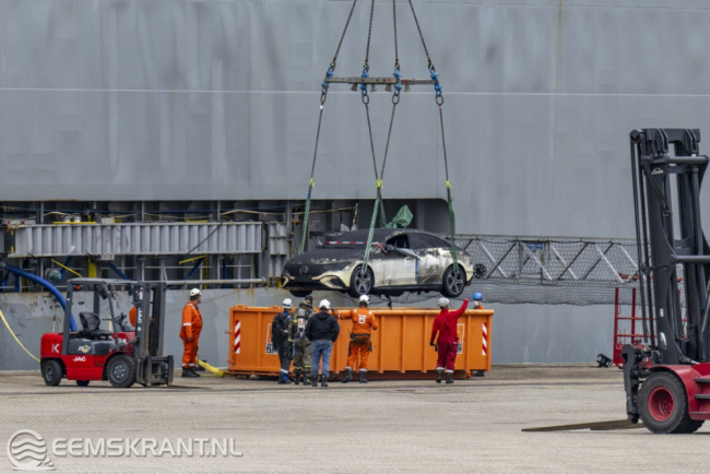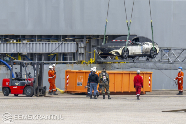 Op woensdagmiddag werd een witte elektrische Mercedes EQE / EQS van boord getakeld, al zwart uitgeslagen van roet. Echter, zodra het voertuig in een gereedstaande container werd geplaatst, ontstond er opnieuw een brand. Bergingsmedewerkers reageerden snel door de container met water te vullen en deze af te dekken om de zuurstoftoevoer naar het voertuig af te sluiten, wat de brand smoorde.