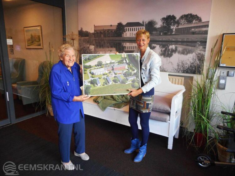 Zijn bijna 90-jarige moeder, R. van der Veen-Bos, die daar tot volle tevredenheid woont, mocht de foto overhandigen aan Sandra Wijers, hoofd zorg. De luchtfoto krijgt een mooie plek in de centrale hal.