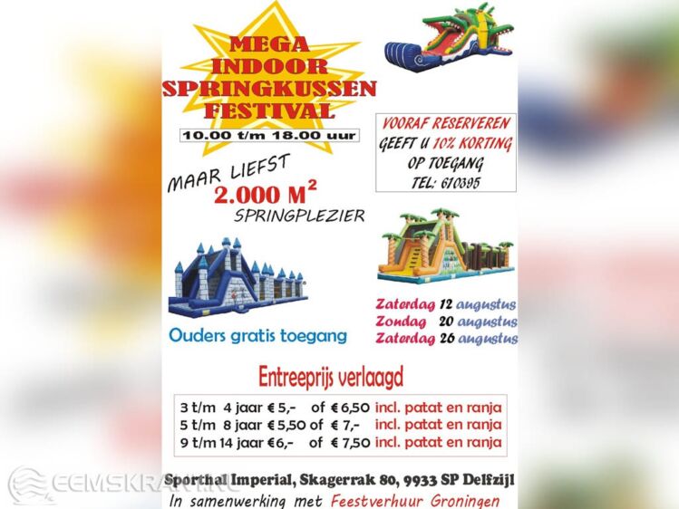 Delfzijl – Vanaf woensdag 2 augustus vind er bij Sportcentrum Imperial aan het Skagerrak een Mega Springkussenfestival plaats. Speciaal om de jeugd eens helemaal uit hun dak te laten gaan. De kinderen kunnen hier van 10:00 tot 18:00 uur terecht. In de maand augustus wordt het springkussenfestival nog een aantal keer herhaald.