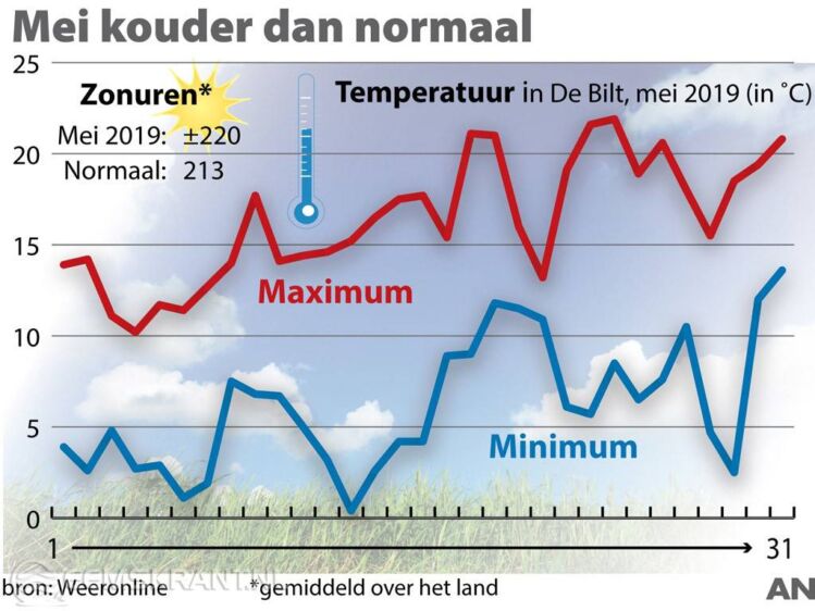 Nederland – Mei 2019 is de eerste te koude maand na dertien warme maanden op rij. De gemiddelde temperatuur komt uit op 11,7 graden tegen 13,1 normaal. Daarmee is het ook de koudste meimaand sinds 2013. Veel dagen verliepen fris en zomerse warmte bleef uit. Landelijk gemiddeld viel ongeveer 40 mm regen tegen 61 normaal. De zon scheen met circa 220 uur een fractie meer dan de gebruikelijk 213 uur.