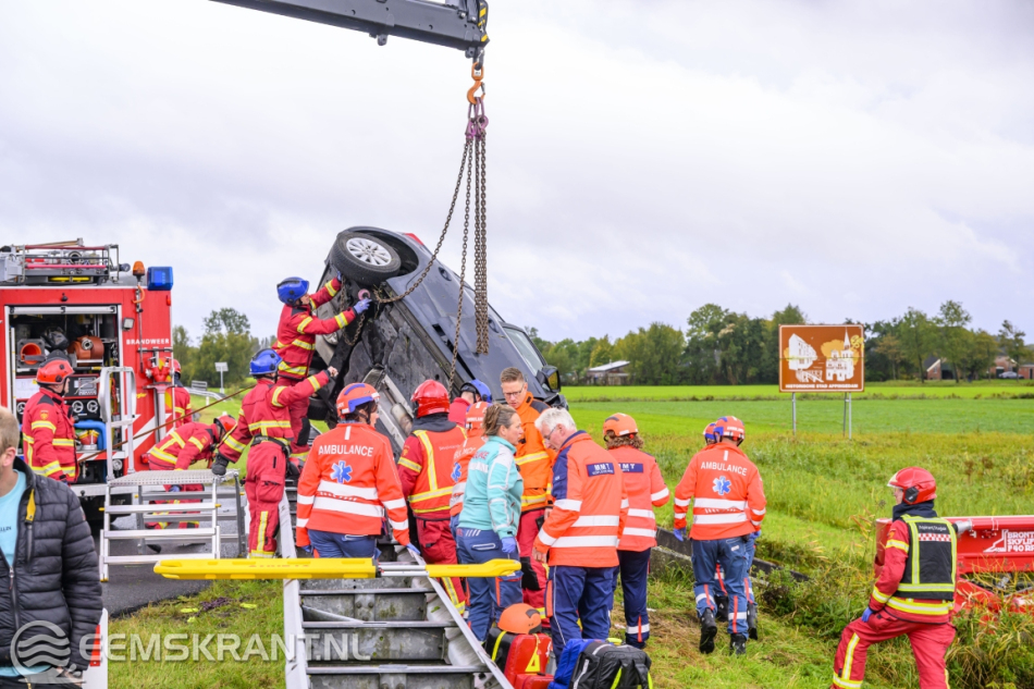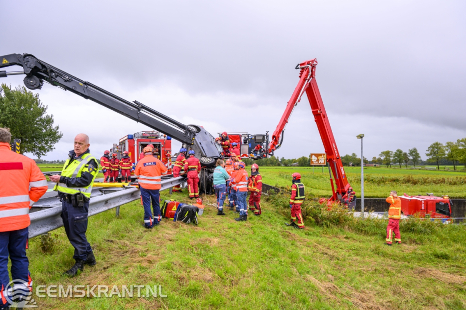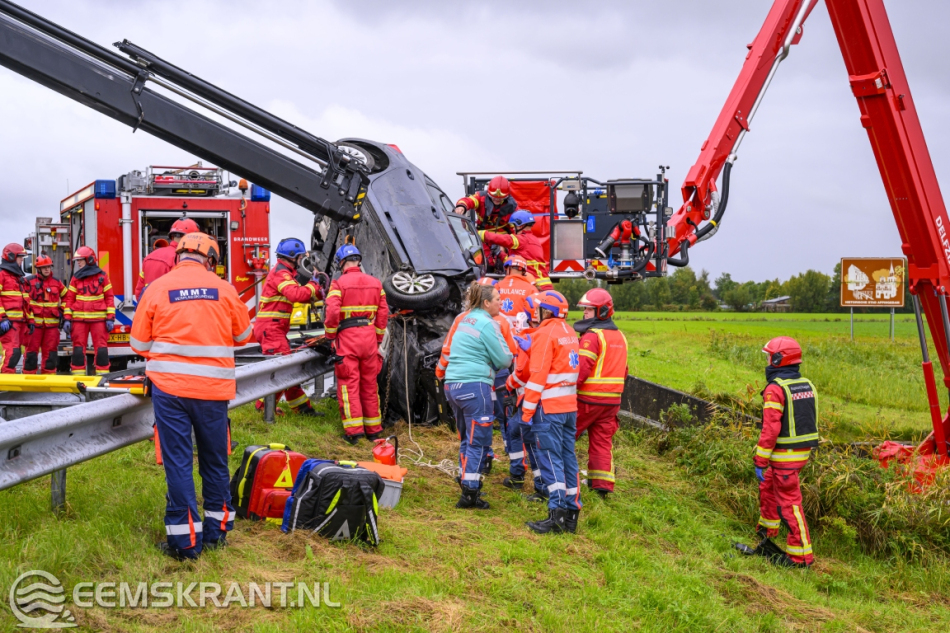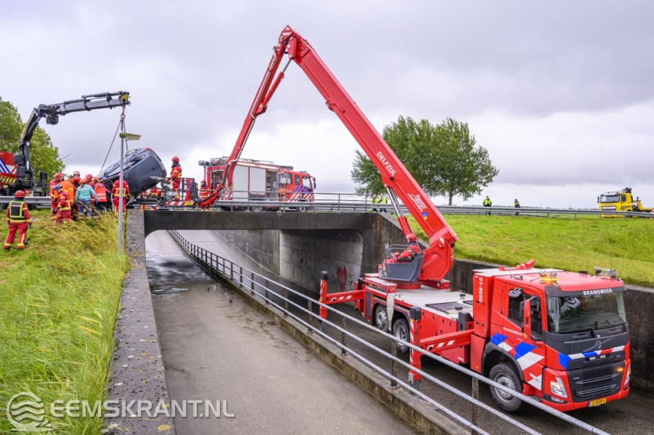 De bestuurder zat bekneld in het voertuig. De brandweer kwam met meerdere eenheden ter plaatse om hulp te verlenen, waarbij ook een hoogwerker werd ingezet vanwege het gevaar dat het voertuig naar beneden kon vallen.
