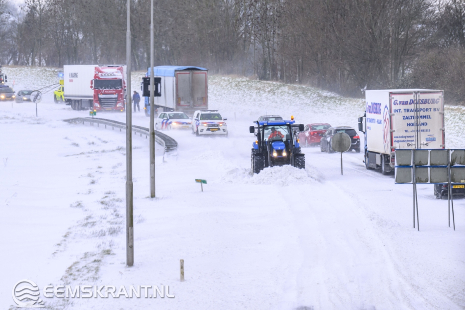 Na het afzetten van de weg schoot een boer uit de omgeving te hulp. Met een trekker werd de weg deels sneeuwvrij gemaakt en kon de vastgelopen vrachtwagen uiteindelijk worden losgetrokken. In de tussentijd kwamen meerdere voertuigen vast te staan op de N33 en hadden hulp nodig om weer op gang te komen. Het wegdek was inmiddels volledig ondergesneeuwd.