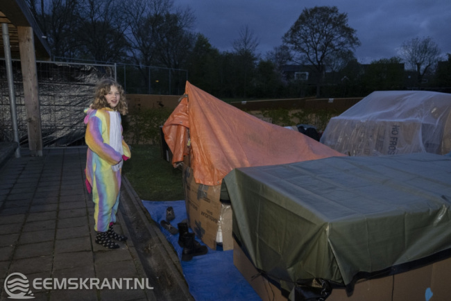 Rond half acht begonnen de kinderen samen met enkele ouders met het maken van hun slaapplekken in de buitenlucht bij Kindcentrum ’t Maar. De avond werd afgesloten met een gezellig samenzijn rond het kampvuur, waarna iedereen zich terugtrok in zijn of haar zelfgebouwde slaapplek voor de nacht.