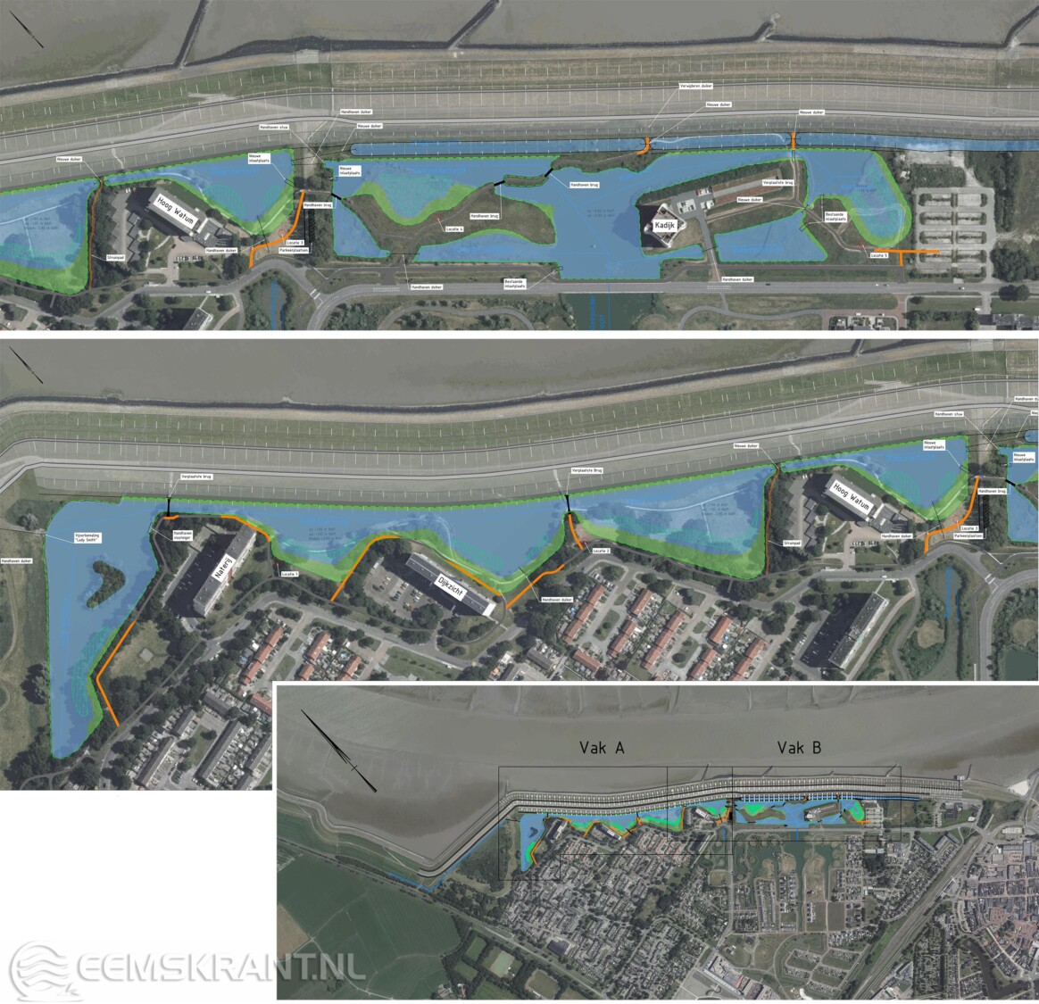 De blauwe kleur geeft het water aan. De grijze en oranje lijnen zijn de paden: grijze wandelpaden zijn er nu al. De oranje wandelpaden zijn nieuw.