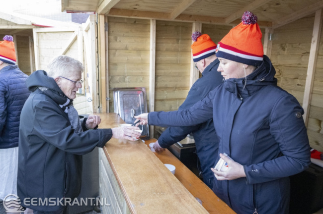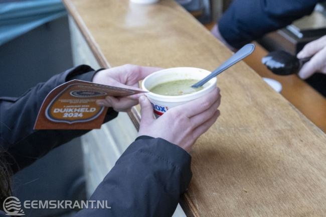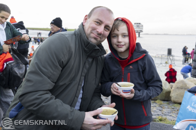 Na de verfrissende duik hadden de deelnemers de gelegenheid om op te warmen met een smakelijke kom erwtensoep, verzorgd door het Eemshotel.