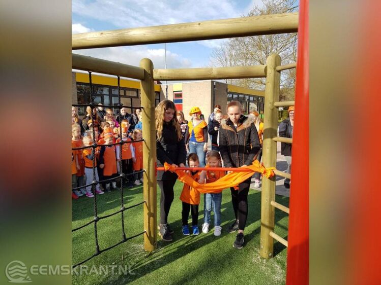 Delfzijl – Afgelopen vrijdag tijdens de Koningsspelen was het dan eindelijk zover. Na een periode van hard werken, door vele ouders onder deskundige toezicht en hulp is het schoolplein van OBS ‘t Zigt klaar. Er zijn in het najaar van 2015 en het voorjaar van 2016 nieuwe speeltoestellen en speelaanleidingen geplaatst. Een schommel , een klimrek, stapstammen, verstopschotten, val dempend kunstgras en nieuw zand in de zandbak. De twee jongste en oudste kinderen van ’t Zigt mochten het schoolplein openen.