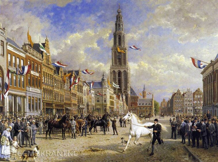 Otto Eerelman: elke rechtgeaarde Groninger kent zijn naam. En wie het stadhuis in Groningen wel eens heeft bezocht, herinnert zich ongetwijfeld “de paardenkeuring,” een schilderij dat Eerelman maakte naar aanleiding van een vrije opdracht van het stadsbestuur. Het schilderij verbeeld een (niet helemaal historisch verantwoorde) viering van Groningens ontzet – 28 augustus 1672 – met onder meer de traditionele paardenkeuring op de Grote Markt. Hoogwaardigheidsbekleders uit die tijd (rond 1920) komen daarop herkenbaar in beeld. Sommigen waren inmiddels overleden, maar werden door Eerelman toch voor het nageslacht vastgelegd. Wie meer wil weten raadpleegt (https://nl.wikipedia.org/wiki/Otto_Eerelman).