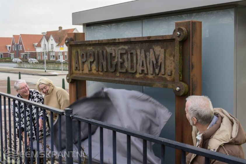 Appingedam – Wethouder Annalies Usmany-Dallinga, wethouder Lea van der Tuin en de voormalige bode en timmerman van de gemeente Appingedam, Jurrie ten Hove hebben woensdag 18 december 2019 samen het plaatsnaambord van het voormalige treinstation Appingedam onthuld. Het meer dan 100 jaar oude naambord heeft weer een plek gekregen in het stationsgebied.