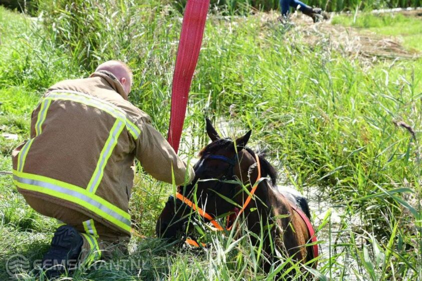 Met een bandje onder het paard door en de kraan eraan wist de brandweer het paard uit de sloot te tillen. Hierna kon het paard samen met de ruiter terug naar de stal.