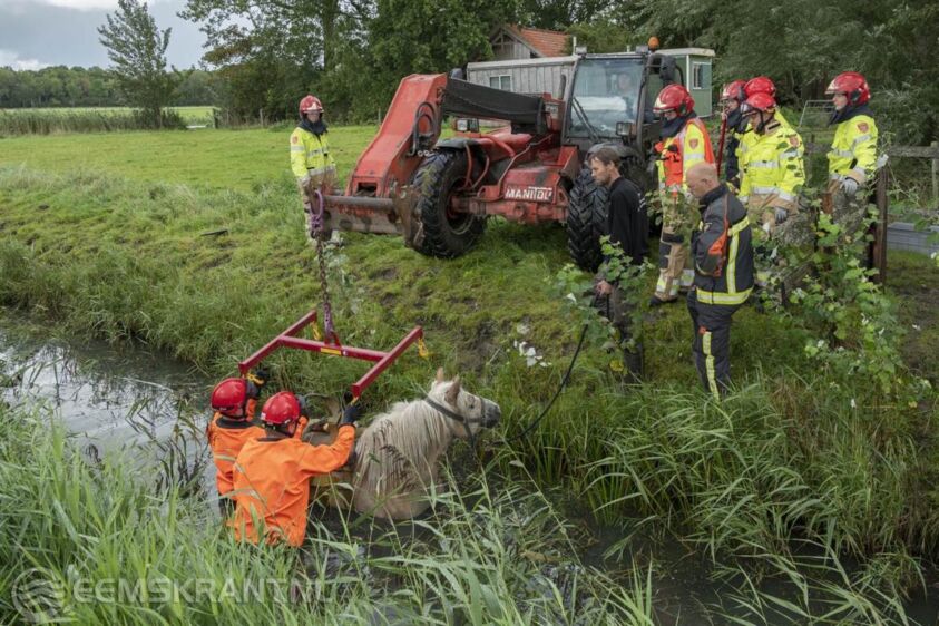 Ook een boer uit de buurt kwam ter plaatse met een verreiker. In eerste instantie werd geprobeerd het paard met handkracht op het droge te krijgen, maar dit lukte niet. Het paard was te vermoeid en werkte niet mee.