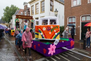 Door de langdurige regen waren de corsowagens deels ingepakt in plastic om ze te beschermen. Tijdens het avondcorso waren de wagens in volle glorie te zien. Ook de kinderen waren bijna allemaal gekleed in regenponcho’s maar de echte vrolijke gezichtjes waren er bijna niet te zien. Sommige wagens deden zelfs helemaal met plastic ingepakt mee, om de vele uren werk toch nog tijdens het avondcorso in volle glorie te kunnen tonen.